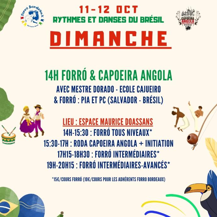 Nous sommes très heureux de vous proposer un grand weekend aux rythmes et danses du brésil avec du Forró, Samba de roda et Capoeira Angola, organisé par Forró Bordeaux et l'école Cajueiro de Capoeira Angola.